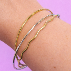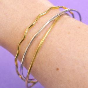 A timeless trio inspired by the soft curves of scallop shells. The interlocking set features two brass bangles (one scallop wave design, one polished) paired with one hammered sterling silver bangle, creating a subtle mixed-metal contrast. Designed to move beautifully together plus comfortable and lightweight for everyday wear. Made with 2mm wire. Handmade in Leigh on Sea by H Sea Jewellery.