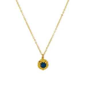 The Maine Gemstone Flower Charm Necklace features a delicate gold-plated chain adorned with a finely crafted flower pendant, centered with a striking blue jade gemstone. Its elegant yet understated design makes it an ideal accessory for everyday wear, adding a touch of sophistication to any outfit. Length: 41 cm, Charm: 1.75 cm 22 ct gold plated brass