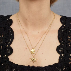NECKLACESThe Ceres Necklace is a meticulously crafted celestial-inspired accessory featuring two fine gold chains. One chain is adorned with a coin embossed with a star motif and set with a precision-cut crystal, while the second chain carries a detailed starburst charm. This design offers an immediate layered effect, combining subtle texture and sparkle to enhance any ensemble. Length: 44 cm + 4 cm extender, Charm: 2 cm 18 ct gold plated brass£39.00 -