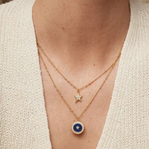 NECKLACESThis exquisite two-line necklace combines elegance and celestial charm, featuring a crystal-encrusted gold star that catches the light with every movement. Complementing this is a navy enamel coin adorned with a delicate, sparkly star motif, adding depth and sophistication to the design. Crafted with attention to detail, the Nebula Necklace offers a refined accessory perfect for elevating both everyday and special occasion outfits. Length: 44 cm 18 ct gold plated brass£42.00 -