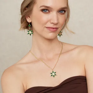 NECKLACESElevate your style with the Geselle Necklace, featuring a stunning northern star-shaped pendant crafted from vibrant green malachite and sparkling crystal. The rich green hues of the malachite beautifully complement the warm gold accents, creating a harmonious and elegant look. This piece serves as a sophisticated statement necklace, perfect for adding a touch of refined glamour to any outfit. For a coordinated ensemble, a matching earrings are also available. Length: Length: 46 cm, Charm: 3.2 cm 18 ct gold plated brass£39.00 -
