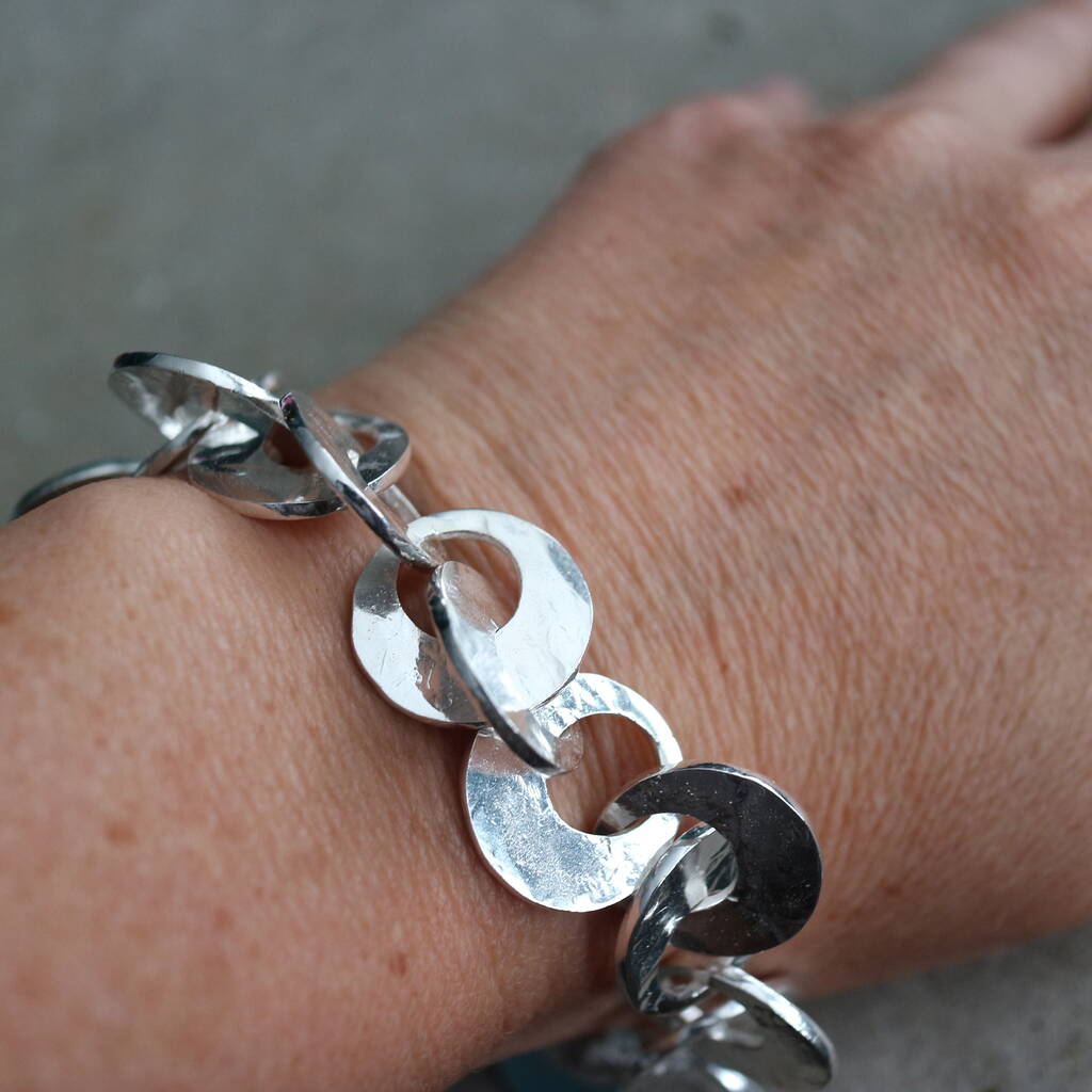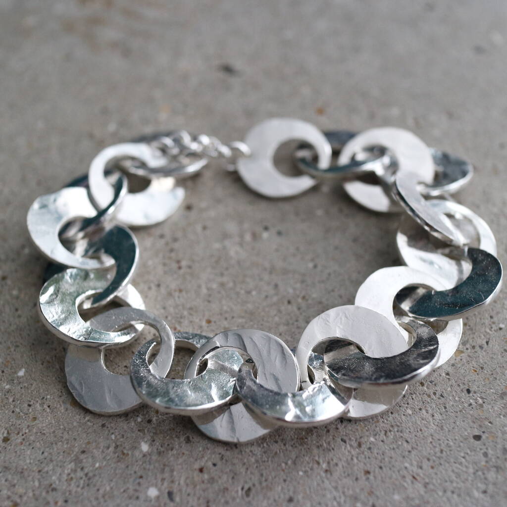 A striking solid sterling silver bracelet, handmade with bold interlocking links and finished with a beautifully hammered texture that catches the light with every movement.