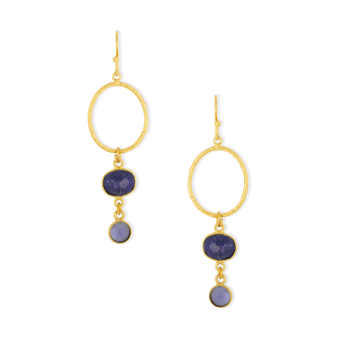 These earrings feature a gold hoop with a delicate oval shape, from which lapis lazuli and iolite navy gemstones elegantly dangle, creating a refined charm with a sophisticated gemstone drop.