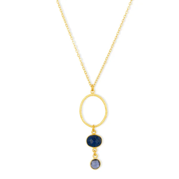 This medium-length gold necklace showcases a refined gold ring charm, adorned with two faceted gemstones: deep navy blue iolite and lapis lazuli. Its delicate design offers a distinctive elegance. To get the full look coordinate with a set of matching earrings.