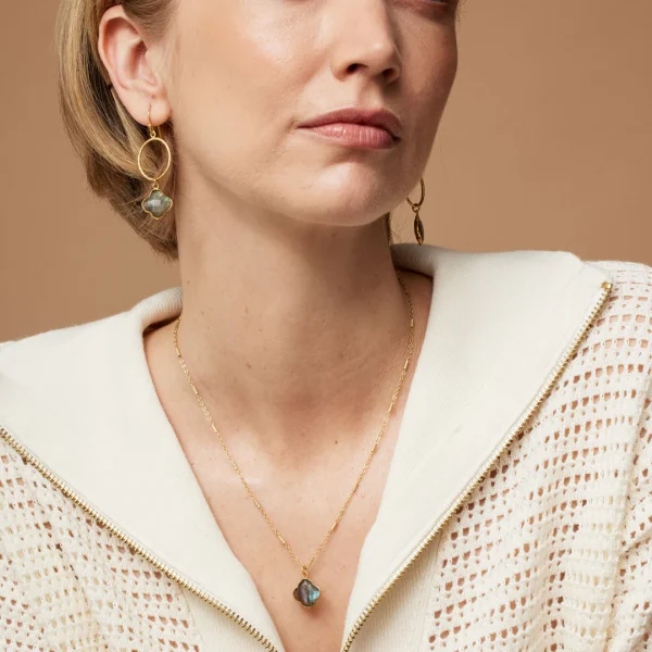 This necklace showcases a clover-shaped pendant made from Labradorite, a natural gemstone known for its shimmering grey tones. It hangs from a delicately crafted 22-carat gold-plated chain, blending sophistication with skilled artistry. Each necklace is carefully handmade, demonstrating precise craftsmanship and attention to detail.