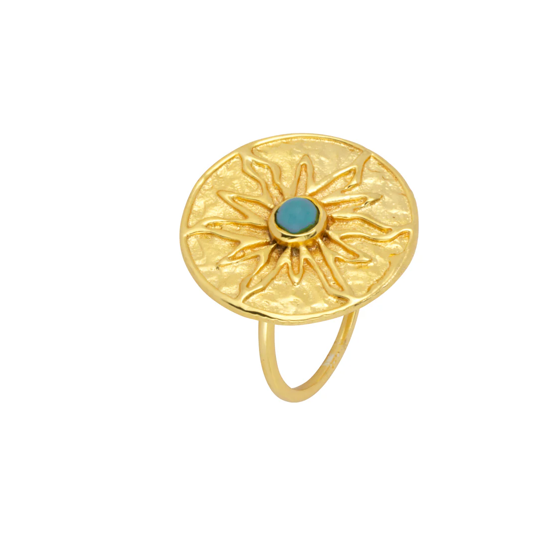Elevate your summer style with our Corfu Gold Sunburst Coin Ring! This playful piece features a dazzling sun pattern coin with a semi-precious turquoise gemstone at its center. The adjustable band makes it perfect for any finger, while its versatile design lets you stack it with our other rings for a personalized look. Complete your sun-kissed ensemble by pairing it with our matching Corfu earrings for the ultimate summer vibe!