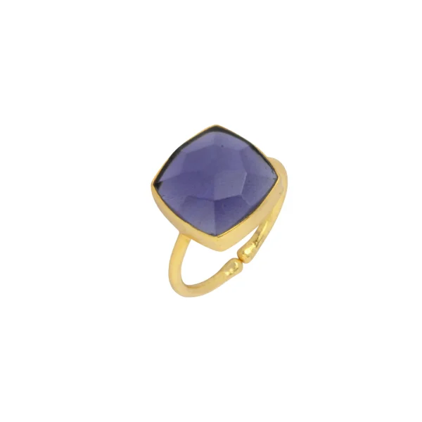 This adjustable gold band features the striking glass-clear purple to navy shades of iolite stone. Designed to fit any finger comfortably, it pairs beautifully when stacked with other fine rings from Ashiana London.