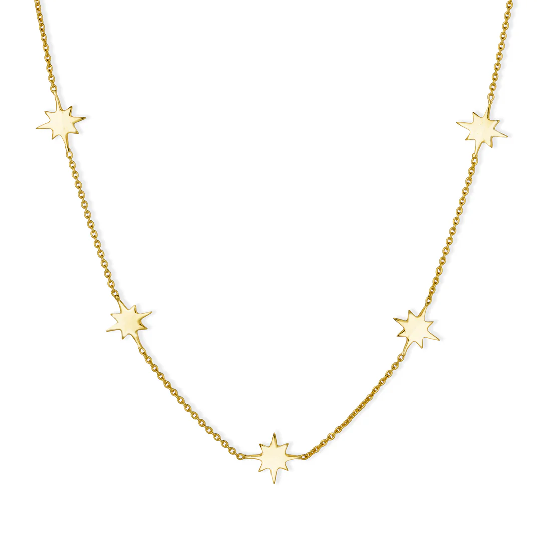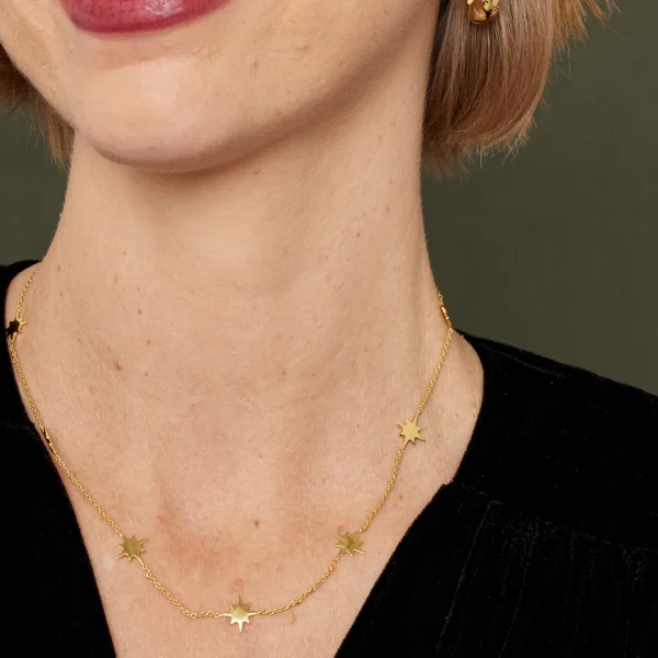 The Sara Gold Star Necklace features a refined design with smoothly finished 22-carat gold-plated charms elegantly spaced along a mid-length chain, reflecting classic sophistication. Highlighted by Northern Star motifs, it brings a celestial charm that enhances both casual and formal outfits.