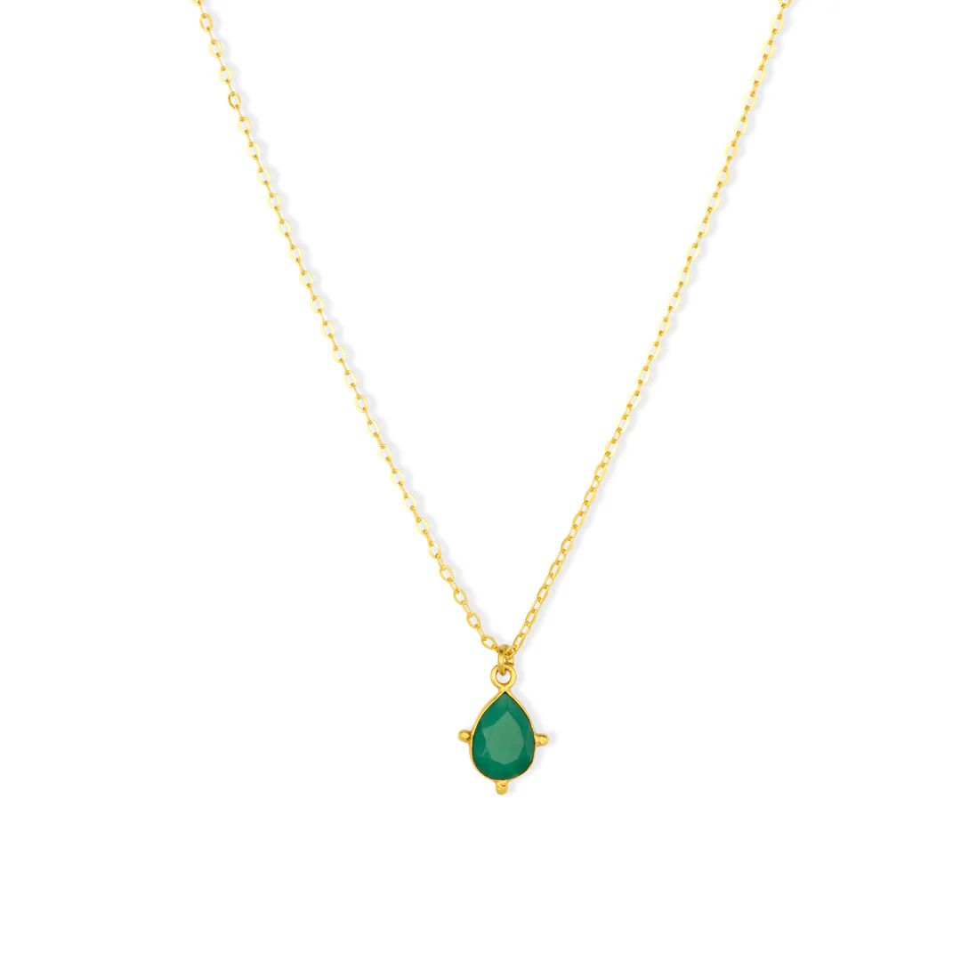 This delicate pendant necklace features a dot-set, tiny faceted teardrop green onyx gemstone, offering an elegant and timeless look suitable for daytime wear. Paired with matching earrings, it makes an ideal gift.