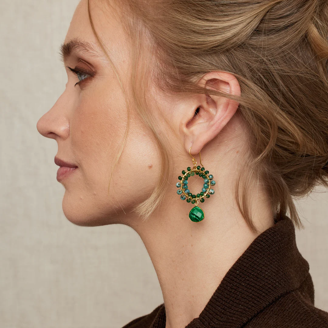 Craft a timeless look with the Talia Earrings Malachite Green, where the radiance of 22 carat gold plated brass meets the mystery of deep green stones. Each earring features a beautiful malachite set stone, complemented by green agate and onyx beads. Balanced at a perfect 4.5 cm, and with hypoallergenic sterling silver posts, they promise comfort for all-day wear. Ideal for those who adore a touch of nature-inspired sophistication in their jewelry collection.