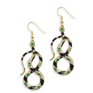 Cascading with ancient charm, these elegant serpent drop earrings echo the captivating allure of the snake. Crafted from high-polish 14ct gold-plating with intricate hand-painted black enamel, they create a striking visual dance. Each curve sits on a fishhook earring is illuminated by shimmering emerald-green crystals, adding a luxurious sparkle.