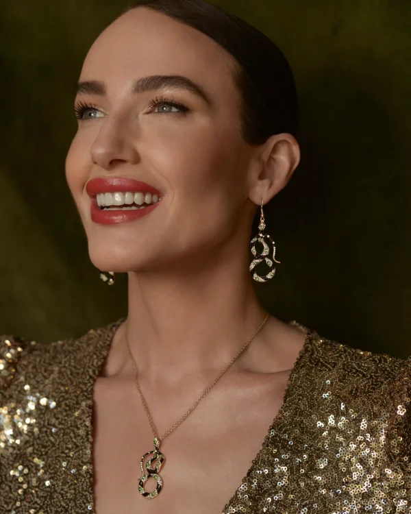 This captivating serpent pendant necklace is a miniature masterpiece designed to adorn your neckline. Crafted from high-polish gold-plated brass with striking hand-painted black enamel, its intricate form is brought to life. Shimmering emerald-green crystals are artfully set alongside dazzling clear crystals, catching the light with every turn.