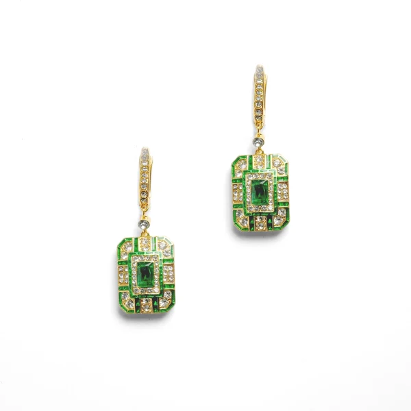 Step back into an era of glamorous sophistication with these exquisite Art Deco drop earrings. Crafted with a polished gold-plated finish, their geometric design is beautifully accented with vibrant green enamel. At their heart, a striking emerald-cut crystal gleams, surrounded by a pavé of sparkling clear crystals that echo the era’s signature brilliance. Each earring offers a 40mm length, ensuring a captivating swing and a touch of timeless elegance for any occasion.