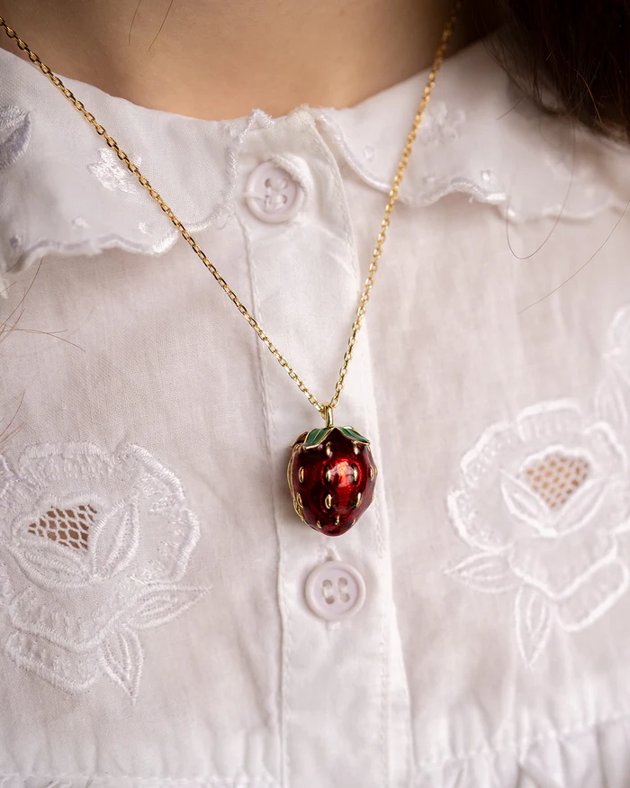 Our NEW Summer favourite. At first glance, a summery strawberry necklace, look closer, and it is one of our signature lockets that opens to reveal our little mouse, sleeping nestled inside the strawberry, designed to be treasured close to the heart.