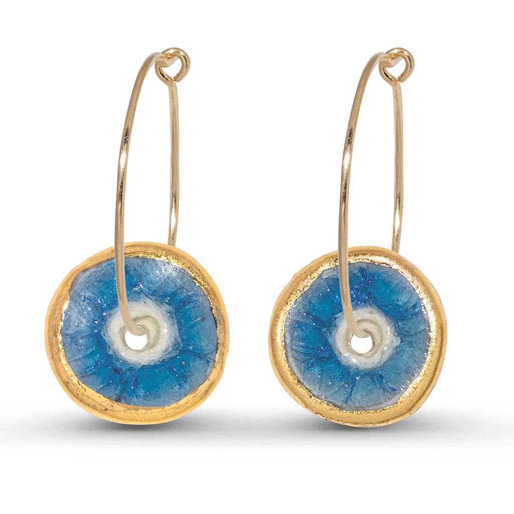 Striking, statement hoop earrings in ceramic with a rich sea-like glass fill and real gold embellishment. A great gift for any jewellery lover, each charm is handcrafted with care.
