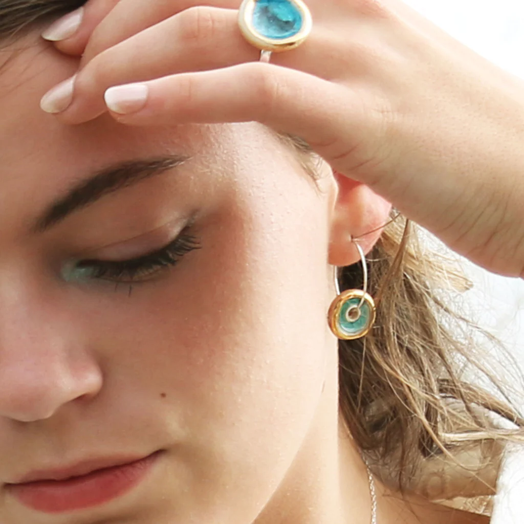 Made from ceramic, glass, real gold detailing and gold fill hoops. Timeless and sophisticated handcrafted jewellery. Each piece has been carefully hand-shaped and painted, adding an elegant and contemporary feel. The kiln-fired glass gives the piece a high quality and gemstone-like appearance. The luxurious smoothness of the pooled glass gives a soothing sensory experience – similar to that of a comforting touchstone you would keep in your pocket. It’s hard to describe, but we just can’t stop feeling the surface with our fingers!
