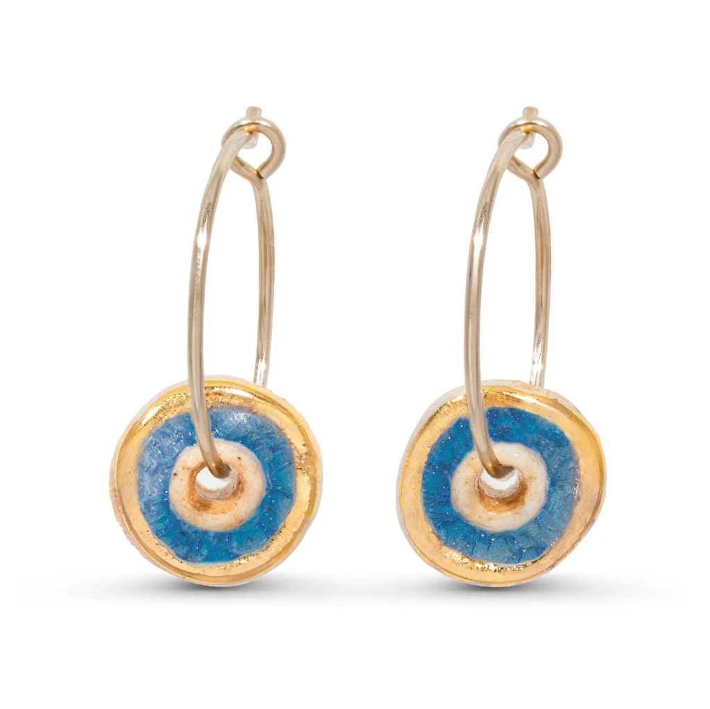 A dainty pair of ceramic and blue glass hoop earrings with real gold embellishment. Inspired by the sea, these vibrant earrings add a delicate flash of colour to everyday or smart attire.