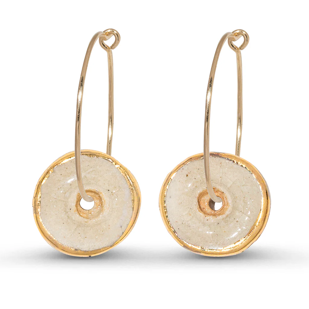 Striking, statement hoop earrings in ceramic with a clear, crackled glass fill and real gold embellishment. A great gift for any jewellery lover, each charm is handcrafted with care.