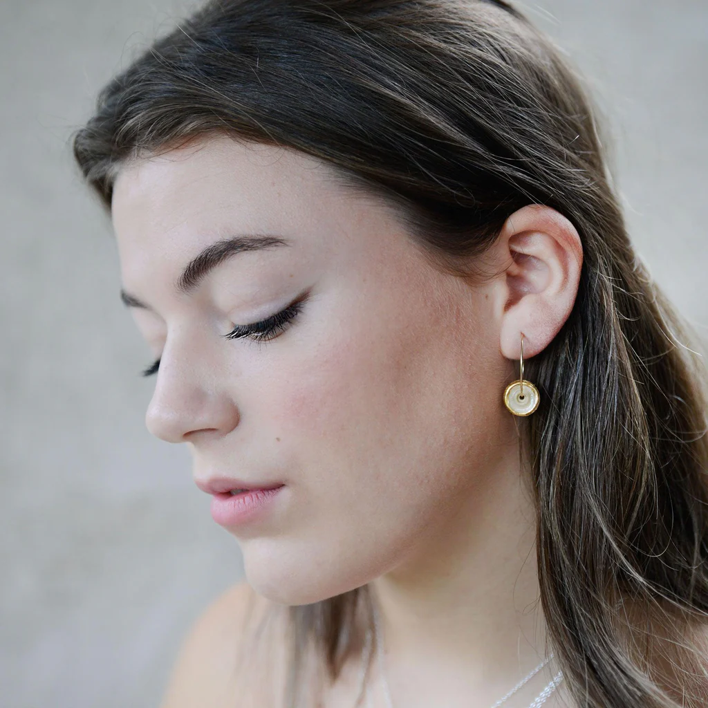 Made from ceramic, glass, real gold detailing and gold fill hoops. Timeless and sophisticated handcrafted jewellery. Each piece has been carefully hand-shaped and painted, adding an elegant and contemporary feel. The kiln-fired glass gives the piece a high quality and gemstone-like appearance. The luxurious smoothness of the pooled glass gives a soothing sensory experience – similar to that of a comforting touchstone you would keep in your pocket. It’s hard to describe, but we just can’t stop feeling the surface with our fingers!
