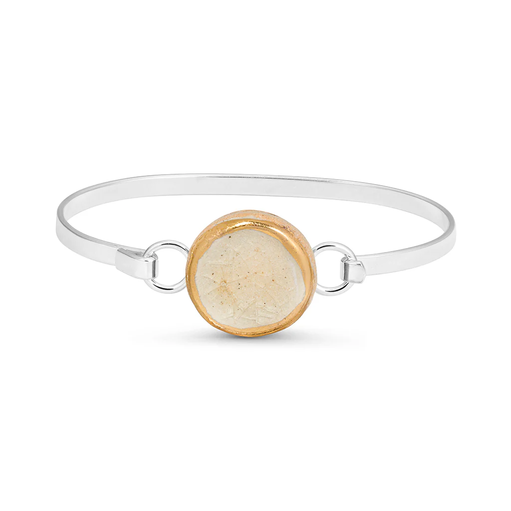 The clasp is situated beneath the ceramic gem. Please note: As each piece is made by hand, yours may vary slightly from the one shown in the images. The outer edge of the gold lustre may fade in time, revealing the ceramic underneath and leaving an inner ring of gold. Please follow our care instructions below.