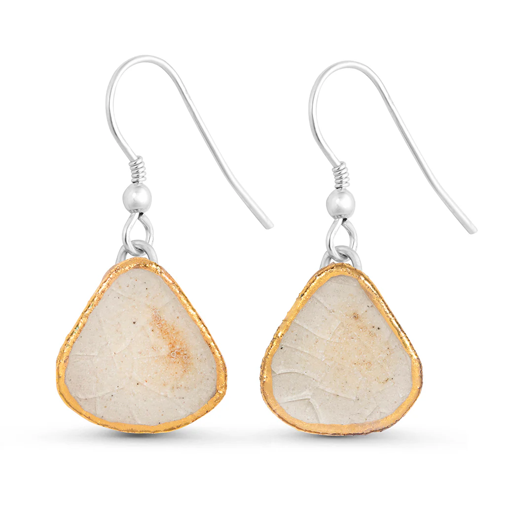 Made from ceramic, glass, real gold detailing and sterling silver hooks. Timeless and sophisticated handcrafted women’s jewellery. Each piece has been carefully hand-shaped and painted, adding an elegant and contemporary feel. The kiln-fired glass gives the piece a high quality and gemstone-like appearance. The luxurious smoothness of the pooled glass gives a soothing sensory experience – similar to that of a comforting touchstone you would keep in your pocket. It’s hard to describe, but we just can’t stop feeling the surface with our fingers!