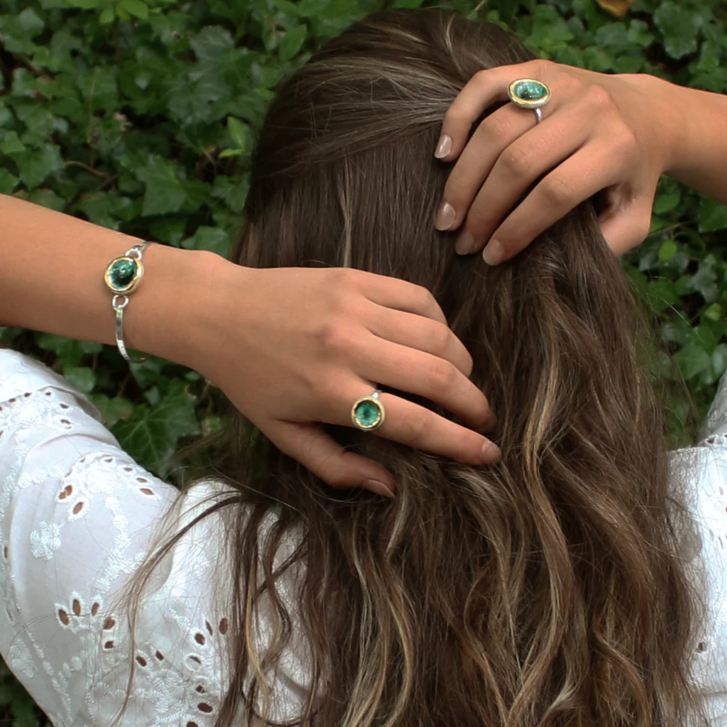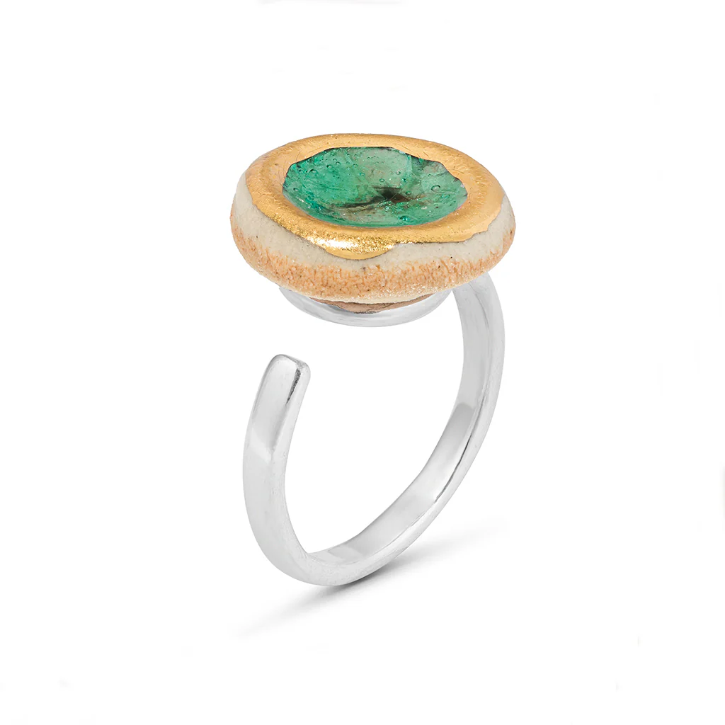 Made from ceramic, glass, real gold detailing and adjustable sterling silver band. Timeless and sophisticated handcrafted jewellery. Each piece has been carefully hand-shaped and painted, adding an elegant and contemporary feel. The kiln-fired glass gives the piece a high quality and gemstone-like appearance. The luxurious smoothness of the pooled glass gives a soothing sensory experience – similar to that of a comforting touchstone you would keep in your pocket. It’s hard to describe, but we just can’t stop feeling the surface with our fingers!
