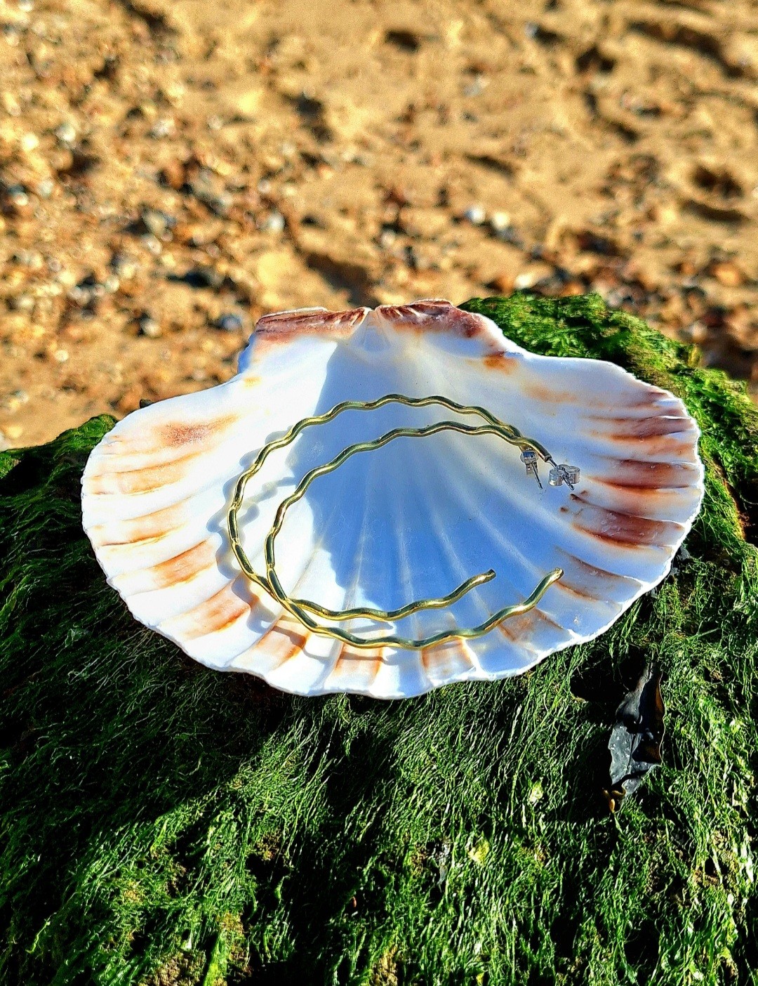 Scallop inspired brass hoops with a wavy finish that catches the light beautifully. Made with sterling silver posts for comfortable everyday wear. Bold yet lightweight, designed to be worn effortlessly.