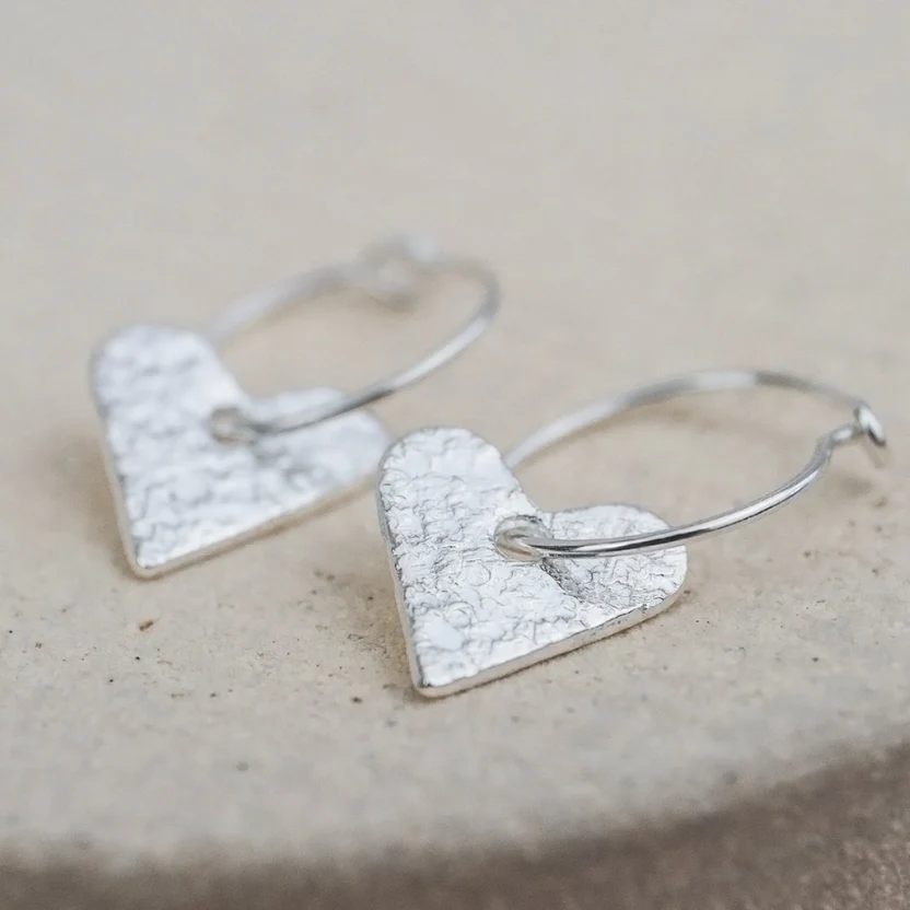 Handmade sterling silver hoops with sterling silver heart charms, each with a delicate hammered texture.