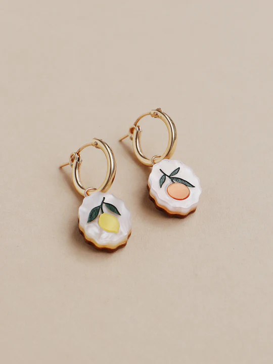 The perfect everyday essential, our citrus charm hoop earrings are lightweight and easy to wear. Inspired by vintage fruit stickers and Mediterranean tiles.