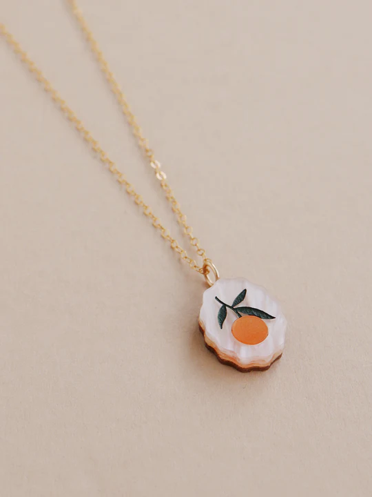 The perfect everyday essential, our orange charm necklace is inspired by vintage fruit stickers and Mediterranean tiles.