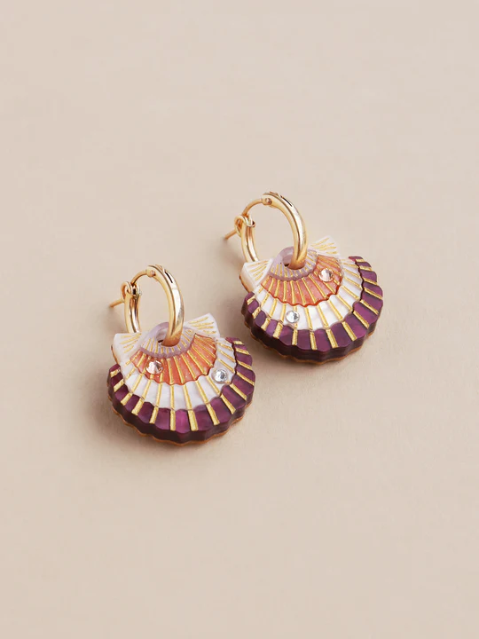Get ready for a sunny day at the beach with our scallop shell hoops! Our lightweight scallop shell hoop earrings are made with high quality crystals and hand-inked details.
