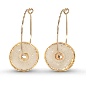 EARRINGSStriking, statement hoop earrings in ceramic with a clear, crackled glass fill and real gold embellishment. A great gift for any jewellery lover, each charm is handcrafted with care. Made from ceramic, glass, real gold detailing and gold fill hoops. Timeless and sophisticated handcrafted jewellery. Each piece has been carefully hand-shaped and painted, adding an elegant and contemporary feel. The kiln-fired glass gives the piece a high quality and gemstone-like appearance. The luxurious smoothness of the pooled glass gives a soothing sensory experience - similar to that of a comforting touchstone you would keep in your pocket. It's hard to describe, but we just can't stop feeling the surface with our fingers! As each individual piece is handmade, each one is completely one-of-a-kind. Therefore, please note that yours will vary slightly to those shown in the images. PLEASE NOTE: The outer edge of the gold may fade in time, revealing the ceramic underneath and leaving an inner ring of gold. Approximate Dimensions: Diameter: 1.3cm Hoop Diameter: 2cm£38.00 -